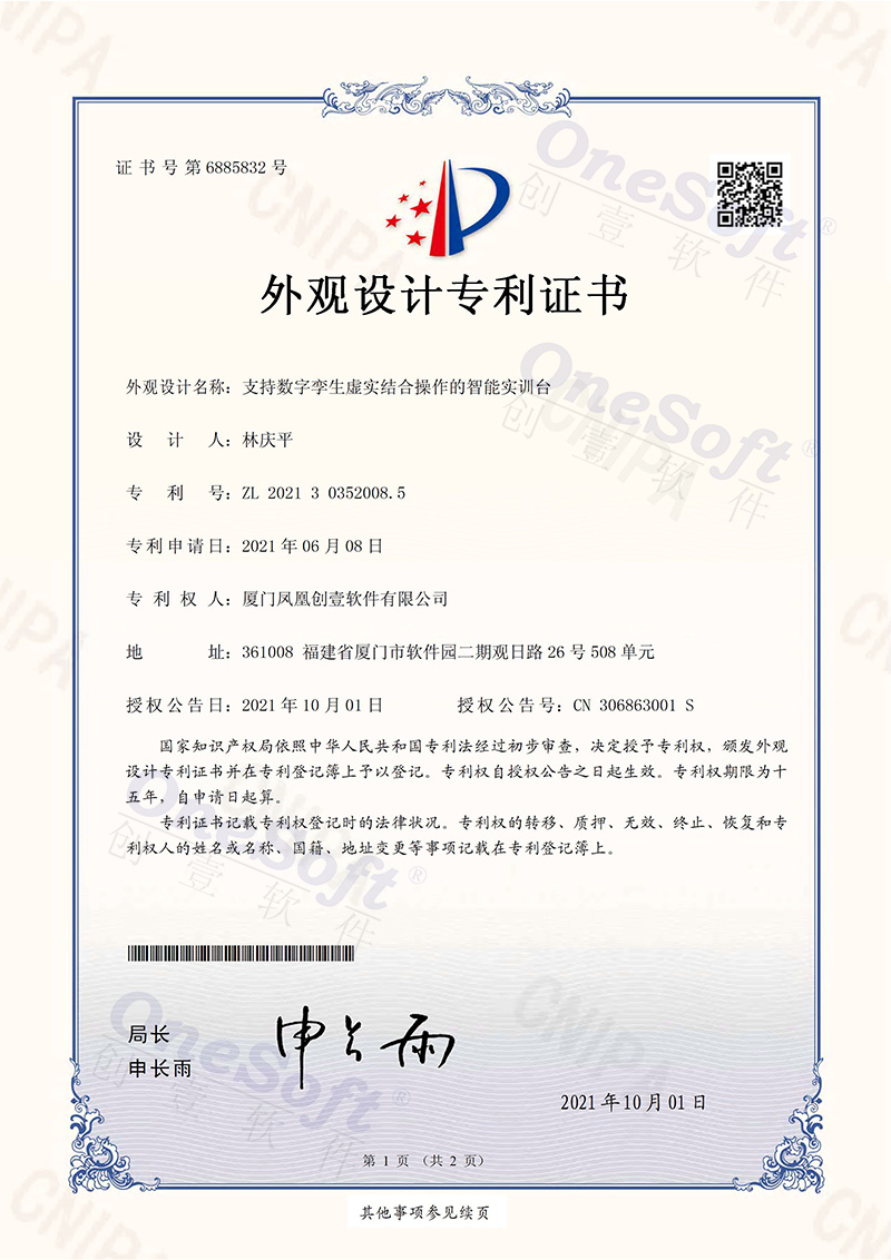 鳳凰創(chuàng)壹智能實(shí)驗(yàn)臺 (外觀設(shè)計(jì)專利證書)