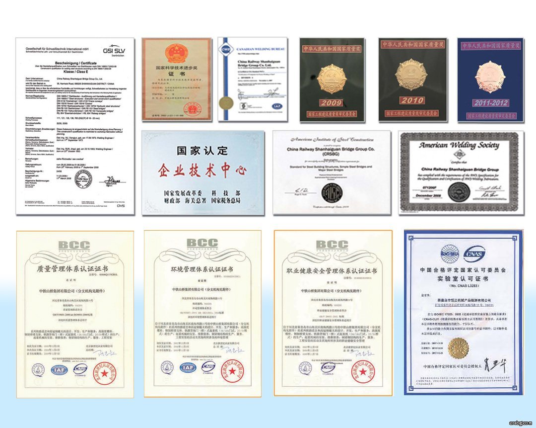 中鐵山橋被列為國(guó)家認(rèn)定企業(yè)技術(shù)中心、中國(guó)鐵道器材研究發(fā)展基地,建有博士后科研工作站。擁有鋼結(jié)構(gòu)工程專業(yè)承包一級(jí)資質(zhì)、鋼結(jié)構(gòu)制造特級(jí)資質(zhì)和建筑行業(yè)總承包二級(jí)資質(zhì)。通過了ISO9001質(zhì)量體系認(rèn)證、ISO14001環(huán)境管理體系認(rèn)證、GB/T28001職業(yè)健康安全管理體系認(rèn)證、英國(guó)UKAS認(rèn)證、美國(guó)鋼結(jié)構(gòu)認(rèn)證、AWS焊接認(rèn)證、AAR道岔認(rèn)證、歐盟TSI道岔認(rèn)證、德國(guó)焊接認(rèn)證、加拿大焊接認(rèn)證和北歐鐵路合格供應(yīng)商認(rèn)證。