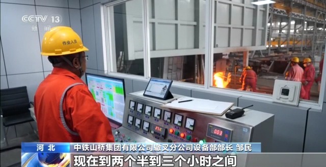 中鐵山橋集團(tuán)有限公司轍叉分公司設(shè)備部部長 鄒民:現(xiàn)在的工作間由以前單一的機(jī)械操作平臺,變成現(xiàn)在全自動的。所有的數(shù)據(jù)采集,包括能源采集、指標(biāo)各種元素的反饋、安全報警裝置,由以前多人變成現(xiàn)在就由一個操作。以前一爐鋼水得煉四個小時左右,現(xiàn)在到兩個半到三個小時之間。
