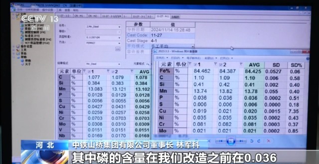 中鐵山橋集團(tuán)有限公司董事長 林軍科:這個表里可以清晰對比到,在改造升級之后,對有害元素、雜質(zhì)、夾雜物的控制,做到大幅度降低。其中磷的含量在改造之前是0.036,今年改造完之后,它控制到0.0128,這對轍叉的使用壽命會有顯著改善。