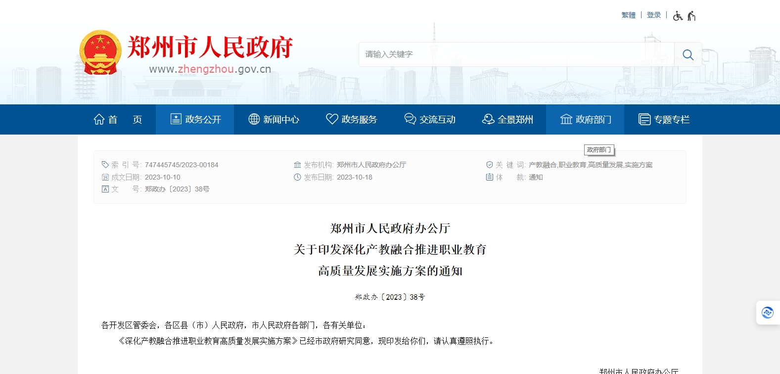 10月18日,鄭州市人民政府辦公廳印發(fā)《深化產(chǎn)教融合推進職業(yè)教育高質(zhì)量發(fā)展實施方案》(簡稱《方案》)。