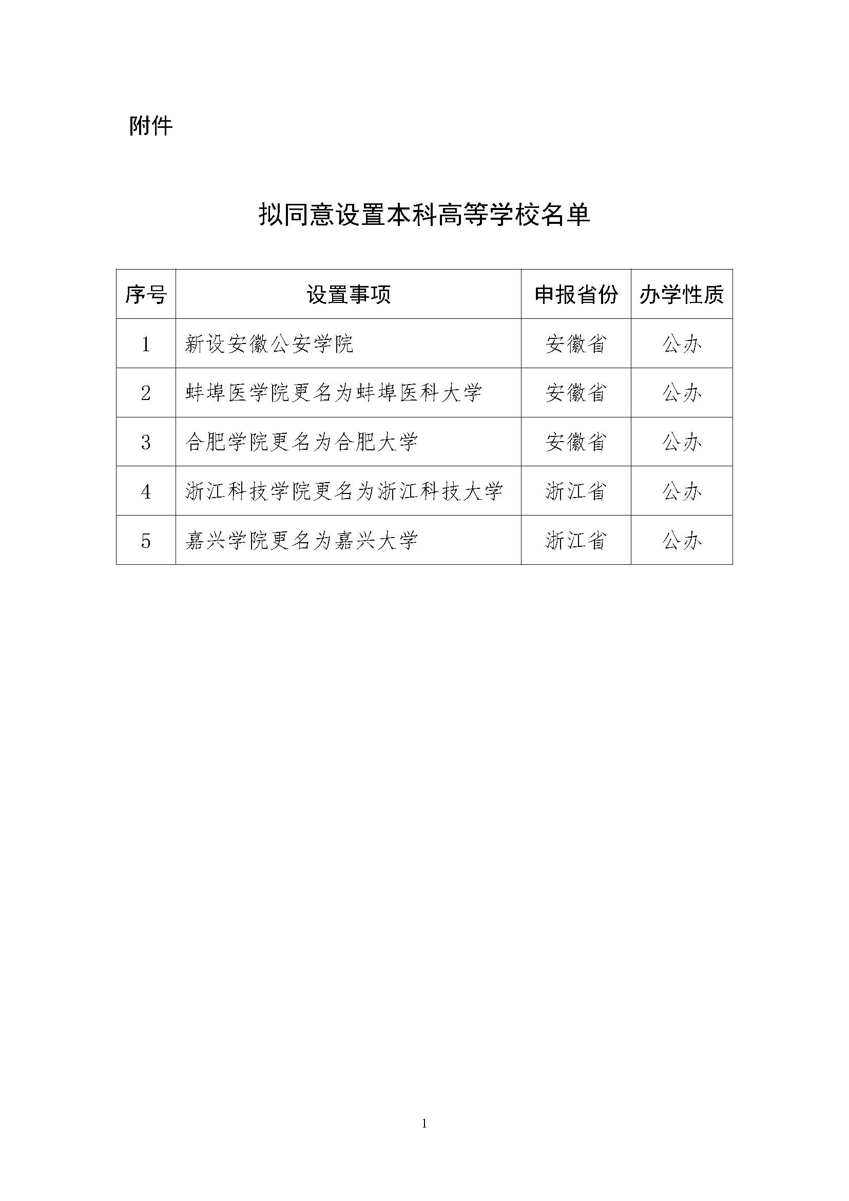 教育部發(fā)布《關(guān)于擬同意設(shè)置本科高等學(xué)校的公示》。公示指出,根據(jù)《中華人民共和國高等教育法》《普通高等學(xué)校設(shè)置暫行條例》《普通本科學(xué)校設(shè)置暫行規(guī)定》有關(guān)規(guī)定以及第八屆全國高等學(xué)校設(shè)置評議委員會考察評議結(jié)果,經(jīng)教育部黨組會議審議,擬同意設(shè)置安徽公安學(xué)院等5所學(xué)校,現(xiàn)予公示。公示時(shí)間為2023年11月20日至11月24日。