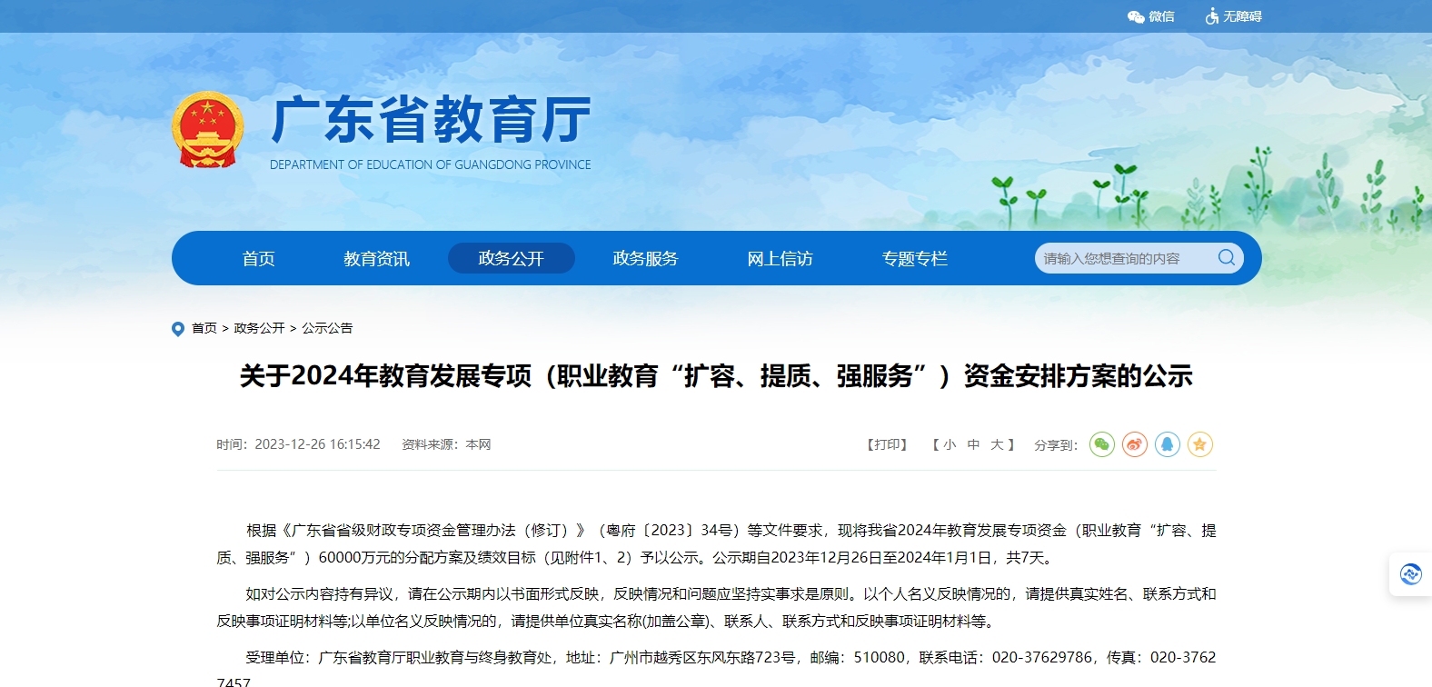 根據(jù)《廣東省省級(jí)財(cái)政專項(xiàng)資金管理辦法(修訂)》(粵府〔2023〕34號(hào))等文件要求,現(xiàn)將我省2024年教育發(fā)展專項(xiàng)資金(職業(yè)教育“擴(kuò)容、提質(zhì)、強(qiáng)服務(wù)”)60000萬(wàn)元的分配方案及績(jī)效目標(biāo)(見(jiàn)附件1、2)予以公示。公示期自2023年12月26日至2024年1月1日,共7天。