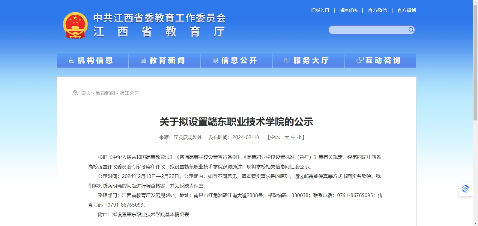 從江西省教育廳獲悉,擬設(shè)置贛東職業(yè)技術(shù)學(xué)院,正在公示中。