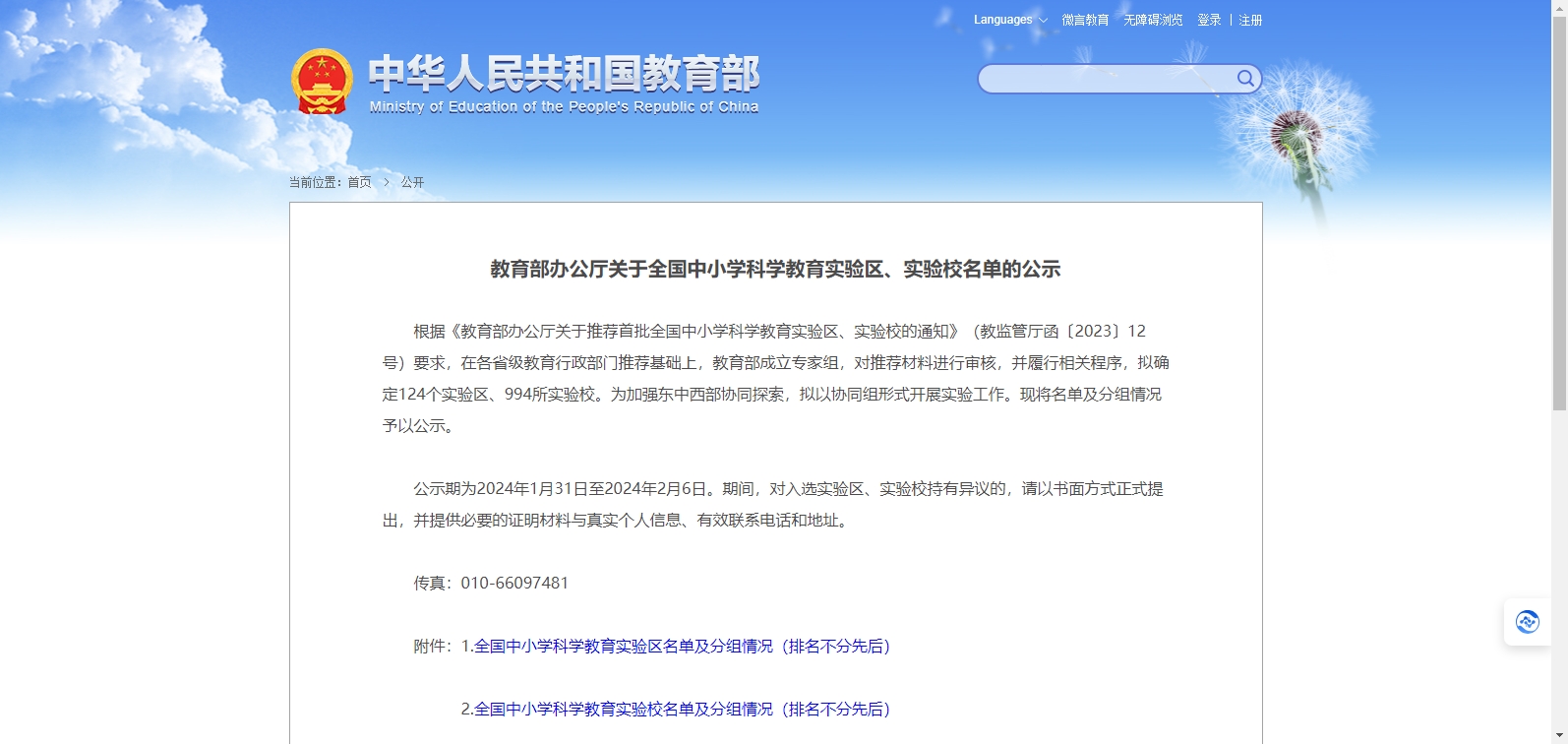 教育部辦公廳關(guān)于全國中小學科學教育實驗區(qū)、實驗校名單的公示