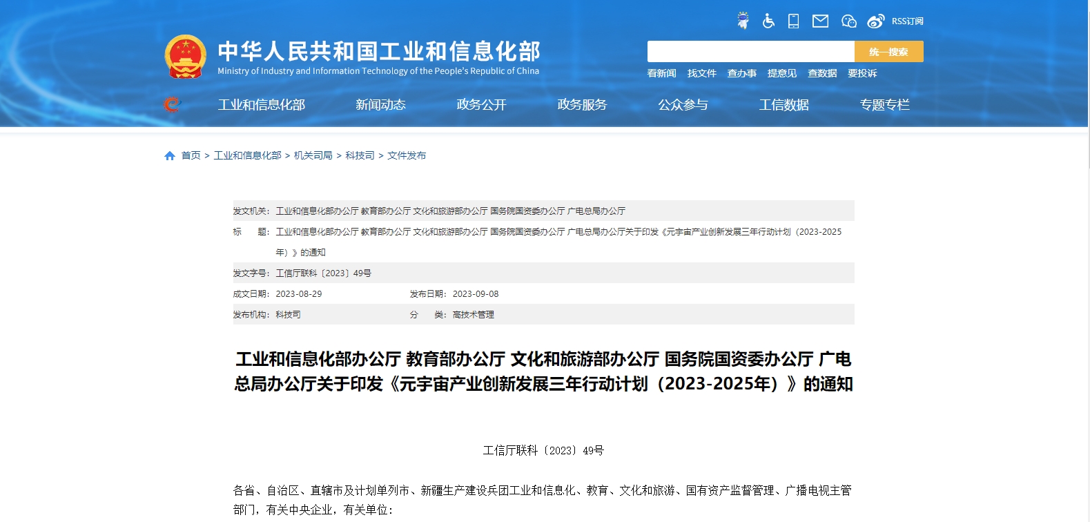 工信部等五部門印發(fā)元宇宙產業(yè)創(chuàng)新發(fā)展三年行動計劃