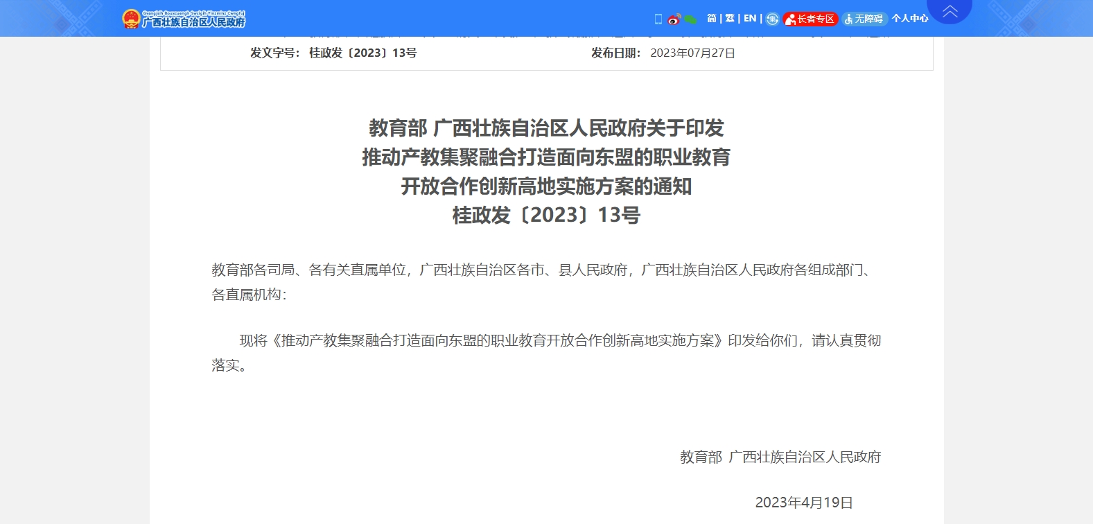 教育部、廣西壯族自治區(qū)人民政府聯(lián)合印發(fā)了《推動產教集聚融合打造面向東盟的職業(yè)教育開放合作創(chuàng)新高地實施方案》