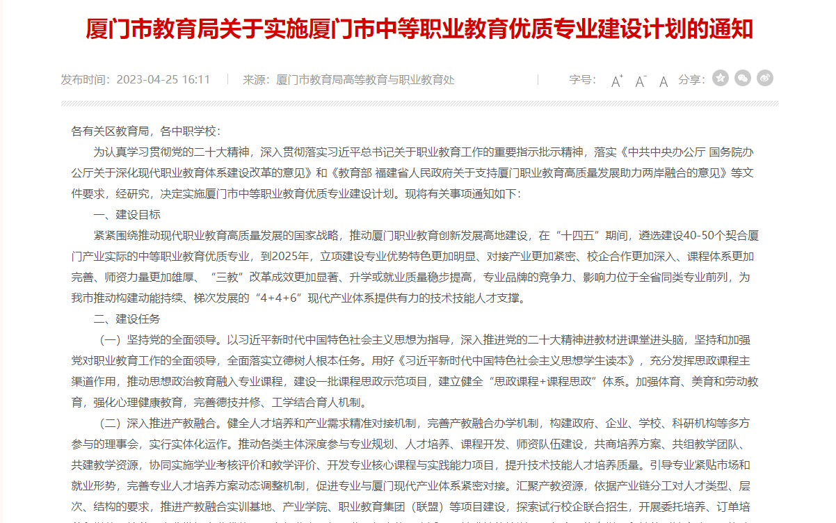 廈門市教育局發(fā)布關于實施廈門市中等職業(yè)教育優(yōu)質專業(yè)建設計劃的通知